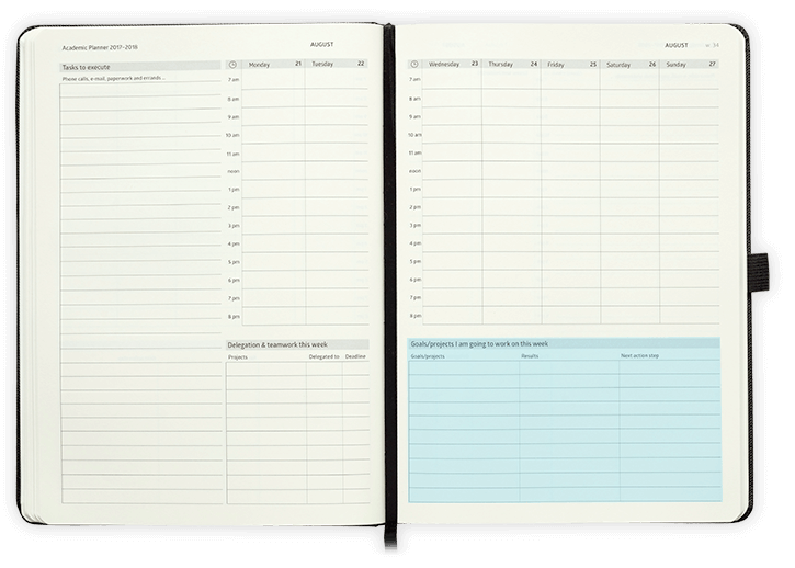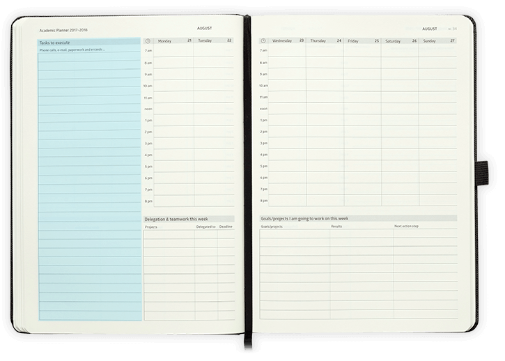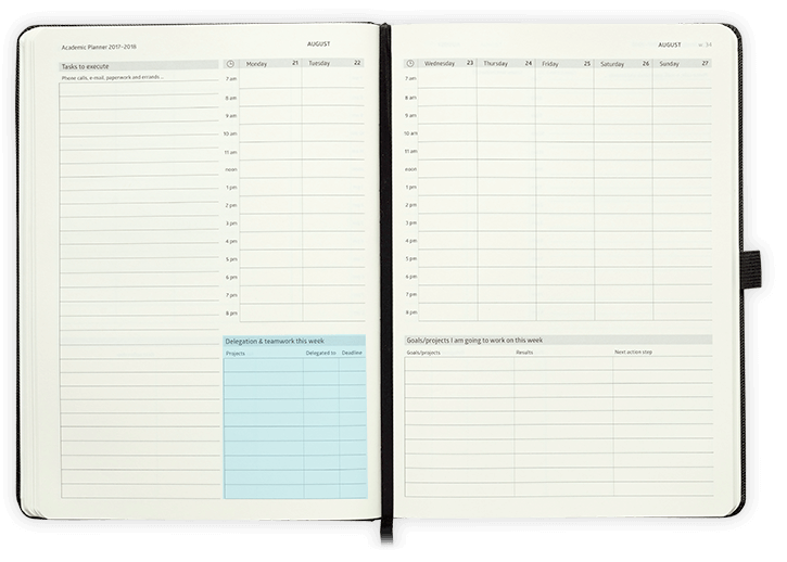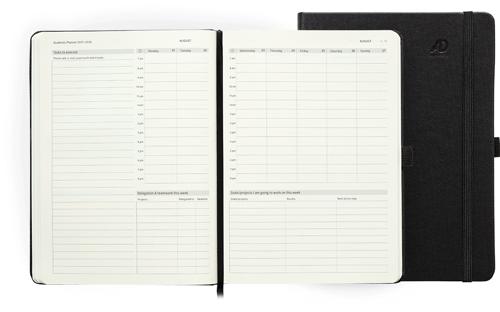 Action Day Planners and Personal Organizers are ideal diares for business, sales managers, startups,busy parents and students. The layout has a 2-page spread which is divided into 4 sections: Diary section, tasks to be completed, weekly goals & projects and a delegated projects section are laid out to most efficiently record, organize and get things done in your business or personal life. A thread bound Action Day planner offers 8x11 inches pages for outlining and accomplishing your goals. In addition to diary and task areas, this personal organizer offers twenty-nine pages to deal with your meeting notes. The hard cover is held by an elastic band to protect your goals, ideas and notes. This appointment book also includes an elastic pen-loop.